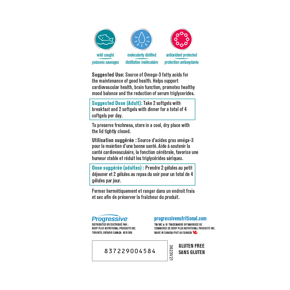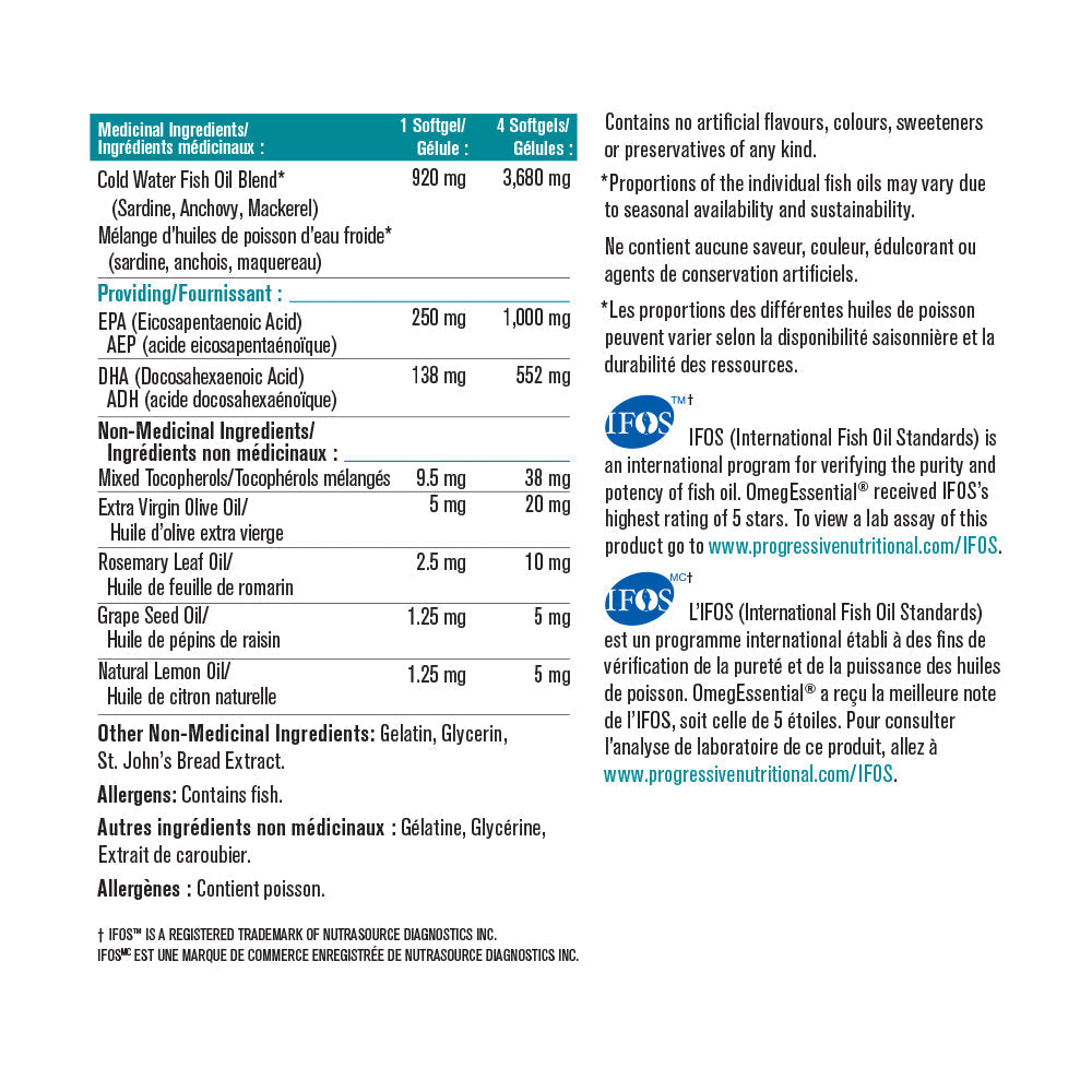 PROGRESSIVE - OmegEssential - 120 Softgel(s) - NPN: 80033215 -- OmegEssential® High Potency Fish Oil is a foundational supplement designed to be taken on a daily ongoing basis. It has a long list of benefits including enhancing mental acuity and brain function, and is ideal for the maintenance of good health. Each serving provides 1, 000mg of EPA and 550mg of DHA in a balanced 2: 1 ratio. It also includes a family of support nutrients designed to naturally enhance your bodys ability to process and utilize the essential fatty acids.