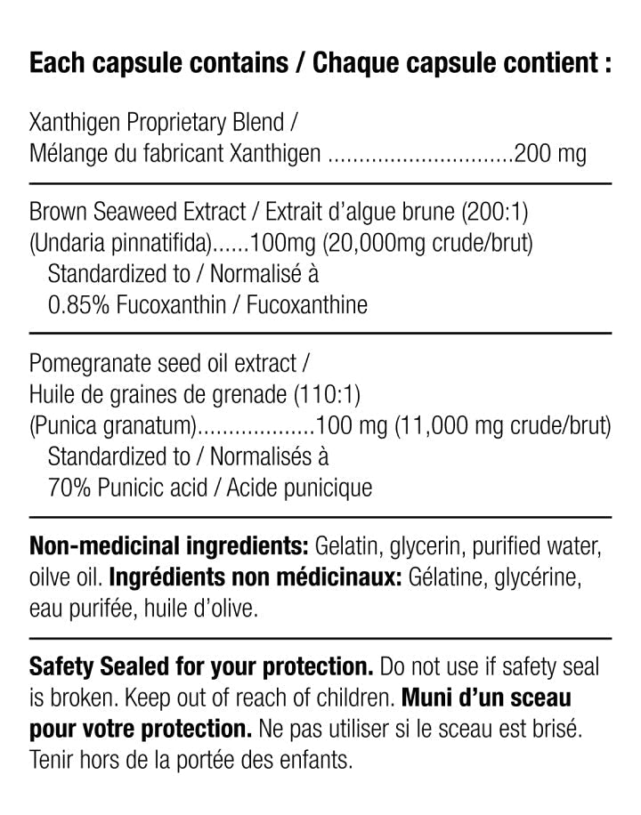 The brown seaweed extract in this product is rich in fucoxanthin, a type of carotenoid (a class of natural pigments found in brown seaweed) antioxidant that protects cells and tissues from damaging effects of free radicals. Fucoxanthin has demonstrated slimming properties by reducing fat storage11,12,13 It is also a source of omega-3 fatty acids which have recognized triglyceride lowering effects. 14